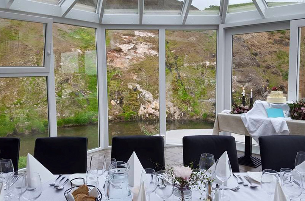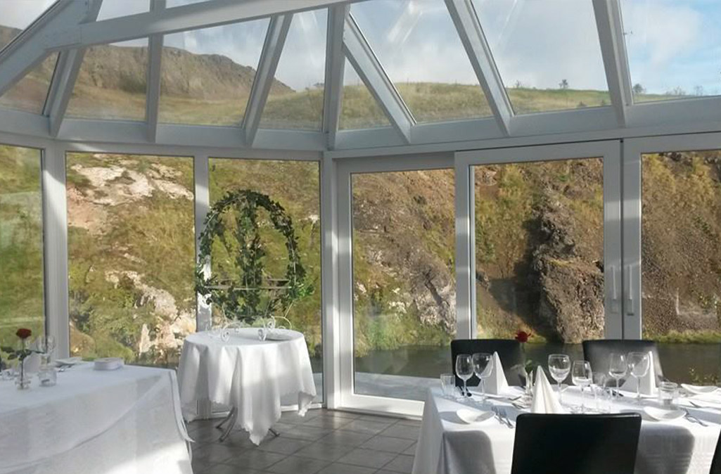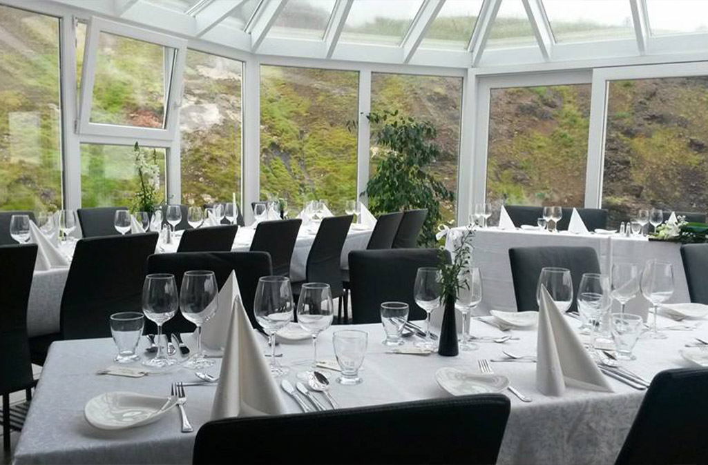 Besides delicious food there are large windows adorn the restaurant hall and the view of Varmá- green hillsides and overgrown gulls are unobstructed in all directions.